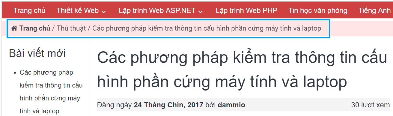 Nhìn vào hình trên, bạn có thể biết được bài viết ở trong danh mục “Thủ thuật” và danh mục này dưới trang chủ 1 cấp.