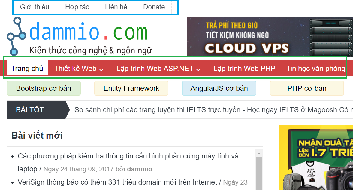 Ví dụ, vào trang web https://www.dammio.com, bạn sẽ thấy 2 menu chính là submenu trên đầu với các trang Giới thiệu, Hợp tác, Liên hệ và menu chính (màu đỏ) với các danh mục Trang chủ, Thiết kế Web, Lập trình Web ASP.NET,… khi bấm vào mỗi danh mục, bạn sẽ thấy danh sách các bài viết hay các danh mục con. Cứ như vậy, bạn đã hình thành cấu trúc website cơ bản rồi đó.