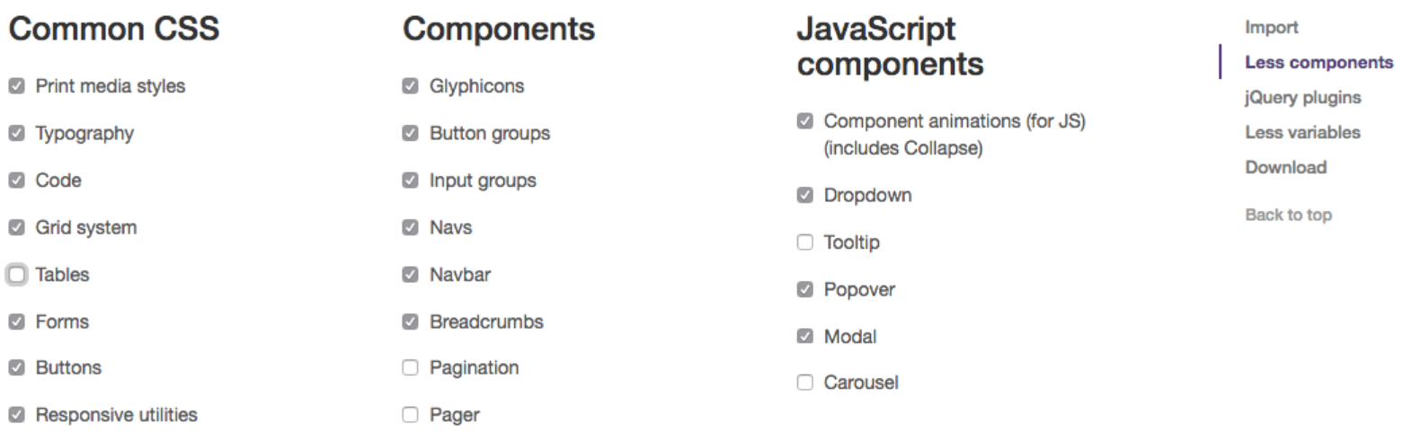 Cấu trúc thư mục Bootstrap đơn giản và dễ hiểu. Tuy nhiên, các dự án web nhỏ và trung bình ít sử dụng hết tất cả các chức năng. Đa số các thành phần phổ biến của Bootstrap là grid, button, form, và menu. Tuy nhiên, Bootstrap còn bao gồm các tính năng khác như slider, pagination, các hiệu ứng hình ảnh, và yếu tố gom nhóm. Tính đến ngày 30 tháng 07 năm 2016, Bootstrap sử dụng các thành phần cấu hình LESS, vì vậy bạn có thể chọn các thành phần cần thiết thay vì nhúng tất cả mọi thứ vào giao diện.
